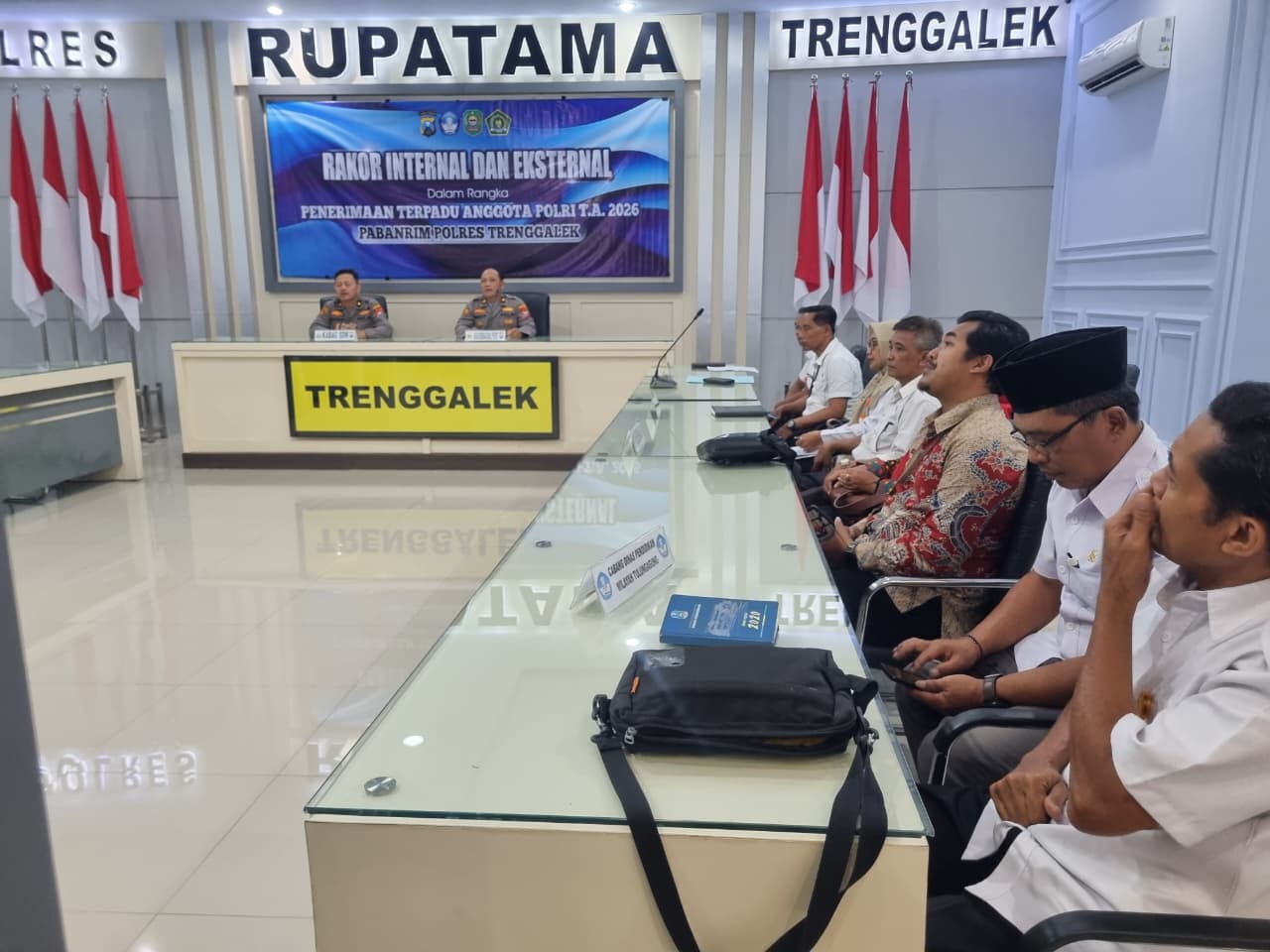 Guna memastikan proses rekrutmen berjalan lancar sesiao dengan SOP yang ada, Polres Trenggalek menggelar Rapat Koordinasi (Rakor) Internal dan Eksternal bersama instansi terkait dalam rangka penerimaan terpadu anggota Polri tahun 2026 di Rupatama Mapolres Trenggalek. Rabu, (11/3).